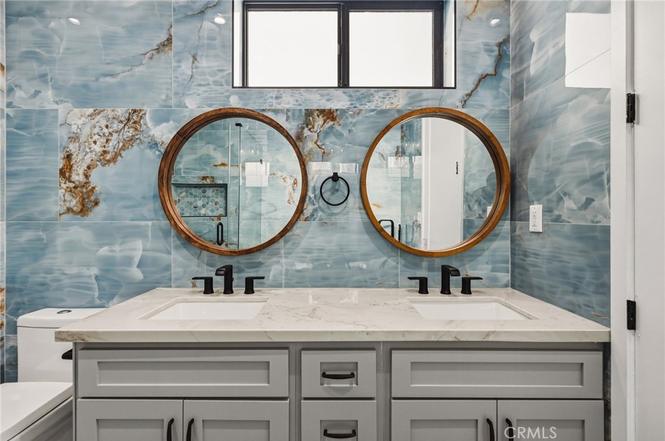 Upstairs include dual primary suites with walk-in closets, baths, and separate en-suite bedroom.